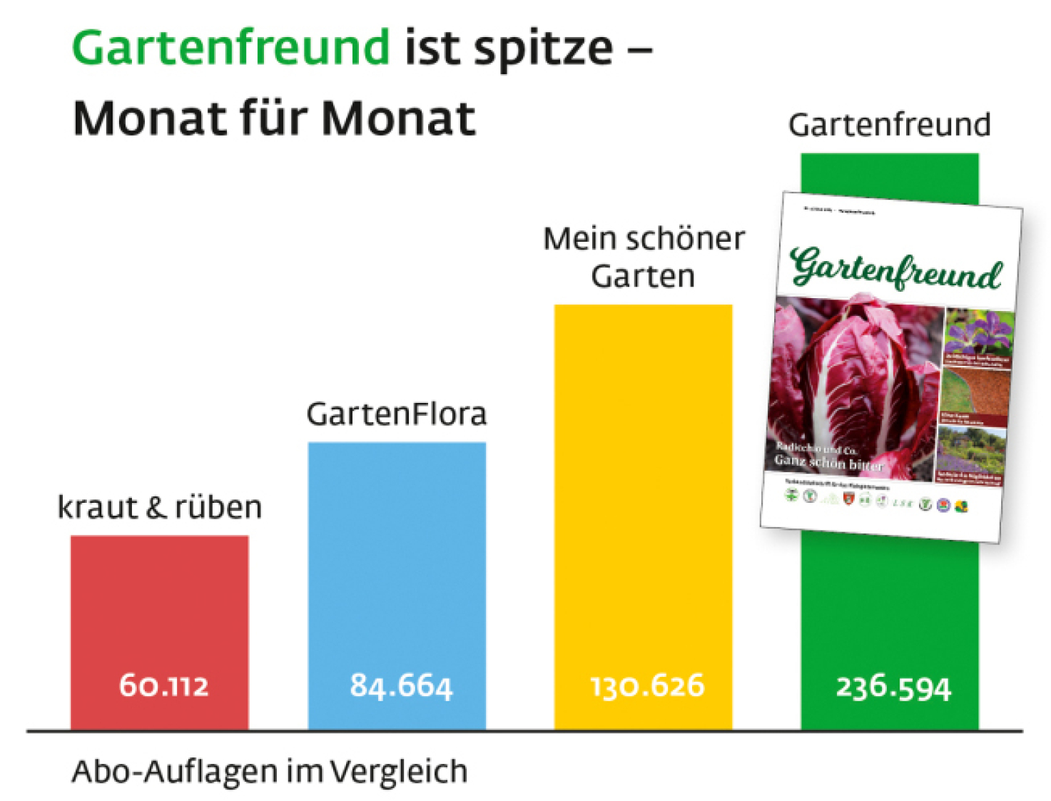 Mit unserer beliebten und modernen Verbandszeitschrift „Gartenfreund“ erreichen wir mit rund 234.000 Abonnenten aus dem Bereich der Kleingärtnerinnen und -gärtner über 500.000 Leser pro Ausgabe – Monat für Monat, auf Basis von über 38 Jahren Erfahrung. Wir berichten in 11 Regionalteilen über die Aktivitäten der Verbände und Vereine und bieten darüber hinaus im überregionalen Mantelteil ausführliche redaktionelle Beiträge rund um:
