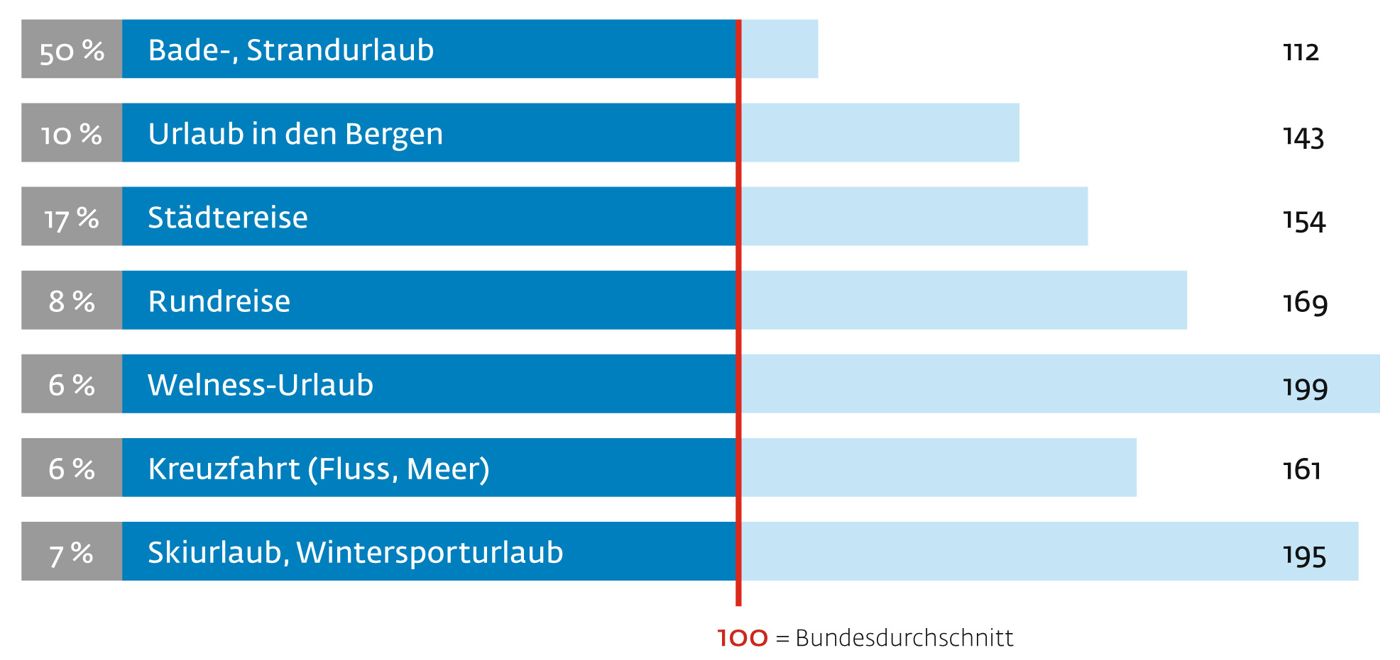 Hinzu kommen dann noch mehrere Kurzreisen von unterschiedlicher Dauer im Jahr. Die Balkenlänge gibt den Indexwert zum Schnitt der Bevölkerung an (100%):