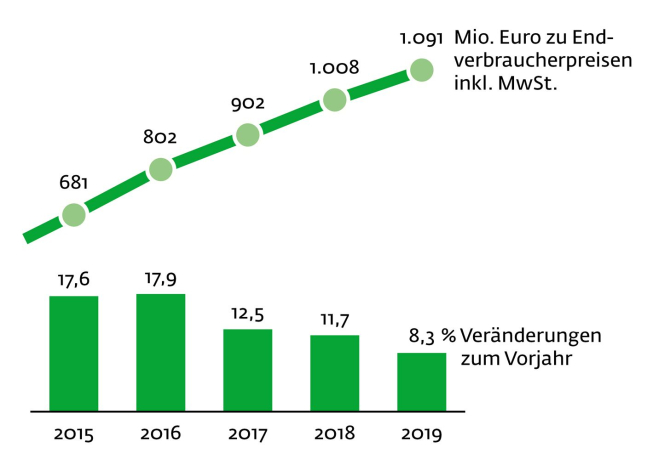 Der Online-Umsatz im Gartenmarkt nimmt stetig zu und hat im Jahr 2019 etwa 1,1 Milliarden Euro erreicht, wobei die Zuwachsraten sich zunehmend abflachen: