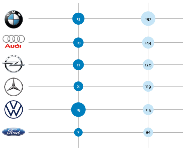 Bayerische Immobilienbesitzer lassen sich nicht auf eine Automarke festlegen, sie haben im Durchschnitt drei Marken, die bei einer Neuanschaffung in Frage kommen. Hier sind die am häufigsten genutzten Automarken: