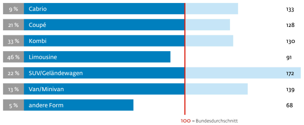 Auffällig ist die Bevorzugung von sportlichen Fahrzeugformen, und über ein Fünftel favorisiert – weit über Durchschnitt – SUVs.