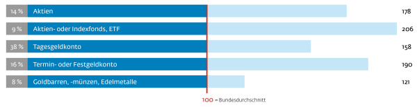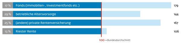 Immobilienbesitzer in Bayern sind zu 29 % gutsituierte Finanzexperten und zu 43 % immobilienaffine Versorger. Das scheint nicht viel, aber im Index liegen sie mit 199 bzw. 243 weit über dem Bundesdurchschnitt. Es wird eher in konservative Sparformen wie Sparbuch, Sparbriefe und festverzinsliche Wertpapiere investiert. Zudem besitzen bayerische Immobilienbesitzer folgende Anlageformen (Mehrfachnennungen möglich; Angabe in % und als Indexwert):